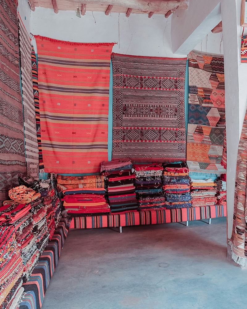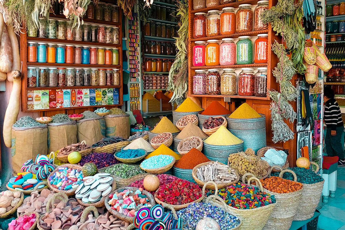 Le nekaj korakov stran se začnejo znameniti souki – tradicionalne tržnice, kjer se med labirintom ozkih ulic razkrivajo zakladi maroške obrti. Tukaj lahko občudujete ročno tkane preproge, usnjene torbe, barvito keramiko, dišeče začimbe in značilne kovinske lanterne. Sprehod po soukih ni le nakupovanje, temveč prava kulturna izkušnja.