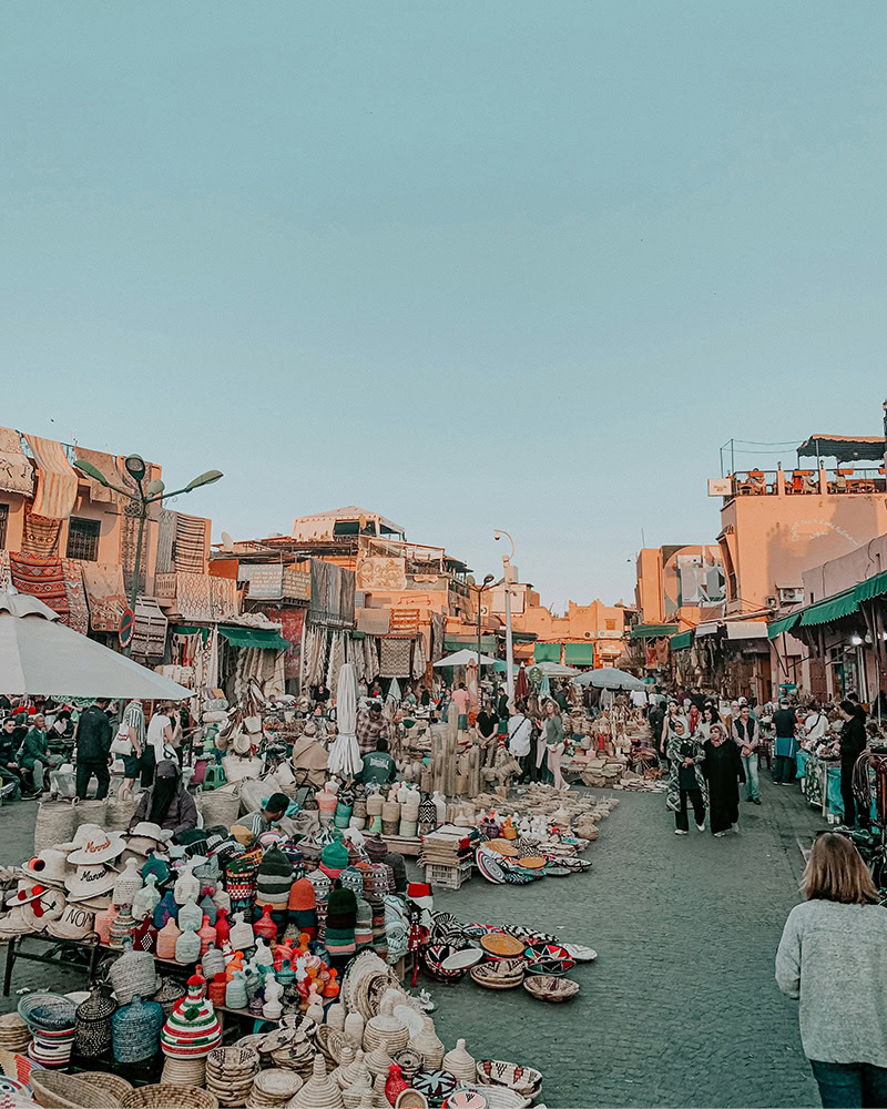 Središče mestnega dogajanja predstavlja znameniti trg Jemaa el-Fna, eno najbolj živahnih in barvitih mestnih prizorišč v Afriki. Čez dan trg napolnijo prodajalci svežih pomarančnih sokov, začimb in lokalnih dobrot, proti večeru pa se spremeni v pravo gledališče na prostem. Glasbeniki, pripovedovalci zgodb in stojnice s hrano ustvarijo edinstveno vzdušje, ki ga je najlepše doživeti z ene izmed strešnih teras ob sončnem zahodu.
